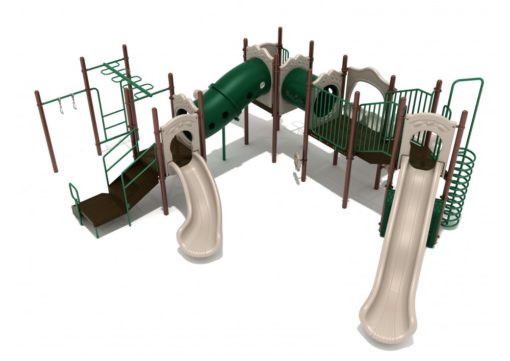 The magnificence of this structure is just covered by its name, the Nebraska. The structure is covered in slides, tubes, and climbers that will satisfy even the most active child. Children can start their adventure at multiple points. For those that like to explore the beat of the playground, the Bongos and Single Drum offer them the music that they crave. The climbers among the group will wiggle across the Overhead Straight Snake Ladder or possibly up the Arched Snake Climber. For those looking for a more direct route to the four slides, the Spiral Climber deposits its climbers directly at the head of the Wave slide. The 90° configuration allows it to nicely fill a fairly square area. Choose between two standard palettes or take your time to customize a look that fits your community. Either way, the Nebraska will bring a royally epic amount of fun to your playground.